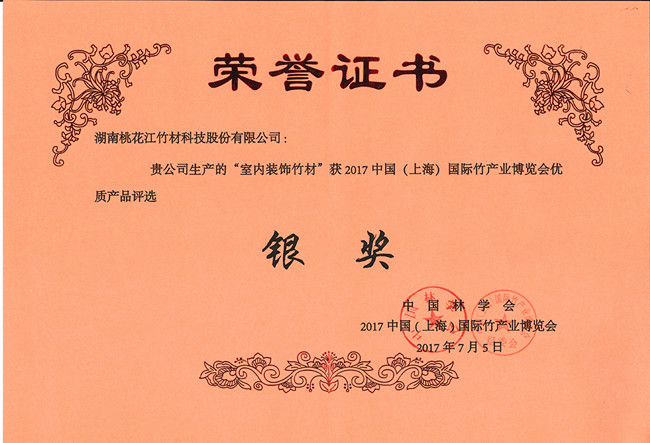2017年7月,在中國(上海)國際竹產(chǎn)業(yè)博覽會產(chǎn)品評選中湖南桃花江竹材科技的室內(nèi)裝飾竹材榮獲銀獎。該榮譽(yù)是對桃花江竹材科技的高度認(rèn)可,桃花江生產(chǎn)的室內(nèi)裝飾竹材取之天然,綠色環(huán)保,古樸自然,是有文化底蘊(yùn)的室內(nèi)裝修裝飾材料,是木材的理想替代品。
