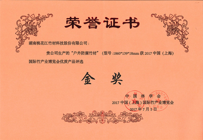 湖南桃花江竹材科技股份有限公司生產(chǎn)的戶(hù)外防腐竹地板在2017年7月中國(guó)(上海)國(guó)際竹產(chǎn)業(yè)博覽會(huì)中榮獲金獎(jiǎng),該獎(jiǎng)項(xiàng)由中國(guó)林學(xué)會(huì)、中國(guó)(上海)國(guó)際竹產(chǎn)業(yè)博覽會(huì)頒發(fā)。湖南桃花江竹材科技作為中國(guó)竹材領(lǐng)域高炭防腐技術(shù)的發(fā)明人,在中國(guó)竹材領(lǐng)域有著舉足輕重的地位。湖南桃花江竹材科技一直專(zhuān)注與于竹材的戶(hù)外運(yùn)用研發(fā)與創(chuàng)新,為全球客戶(hù)提供高品質(zhì)竹材。